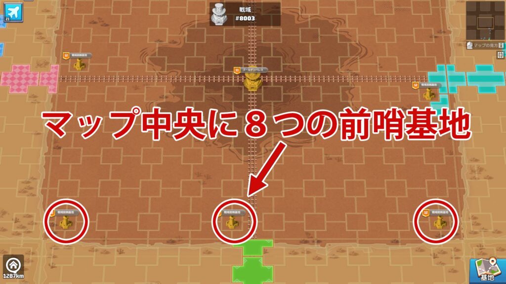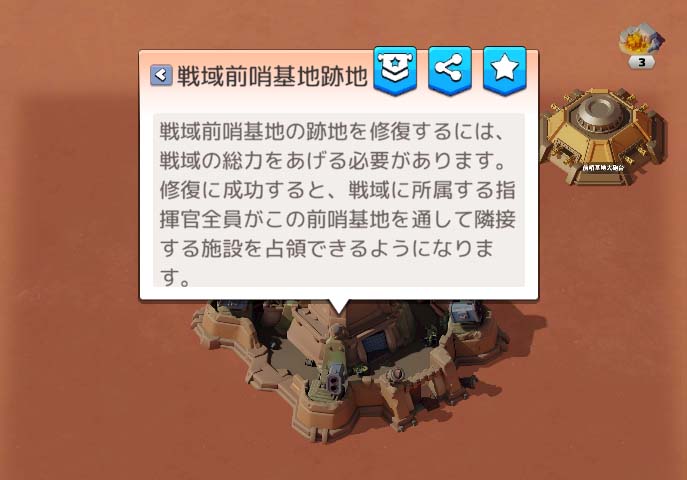 ゴールデンパレス付近(マップ中央)には8つの前哨基地が設置されています。戦域の総力をあげることで前哨基地を修復することができ、修復に成功すると戦域内の「全連盟」がこの前哨基地を足掛かりにマップ中央へ侵入(前哨基地と隣接するマス)することができます。