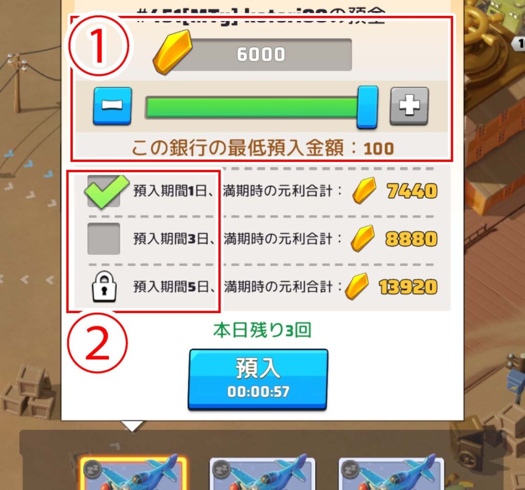 一回の預け入れMaxは6,000で[1日・3日・5日]の中から預金期間を選択します。※5日間預金はシーズン2週目より解放