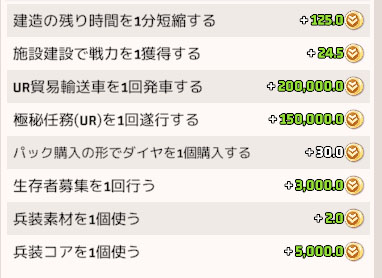 建築以外にUR貿易輸送車の発車、UR極秘任務を遂行、生存者募集を行うなど。ゲームが進んでいくと兵装研究所の素材やコアも2日目のポイント対象となります。