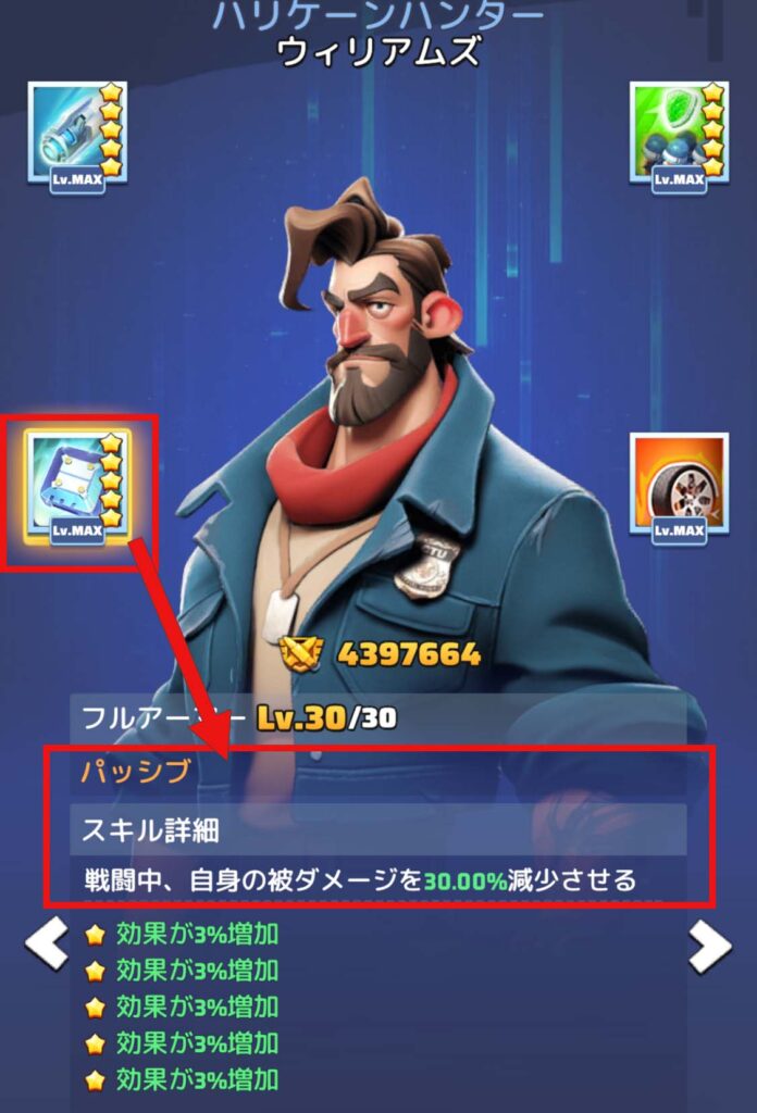 ウィリアムズはとにかく自己防衛に優れています。戦闘はまず左前衛が狙われるので、左前衛には自己防御力が高いウィリアムズを配置。