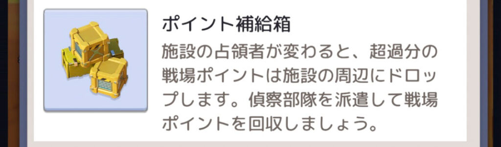 敵が長時間占拠している建物がある(敵もそこにいる)ケースで、遠方からその施設へ派兵すること。攻撃が成功して、施設が赤から青に変わると補給箱が出てしまう(敵に取られる)