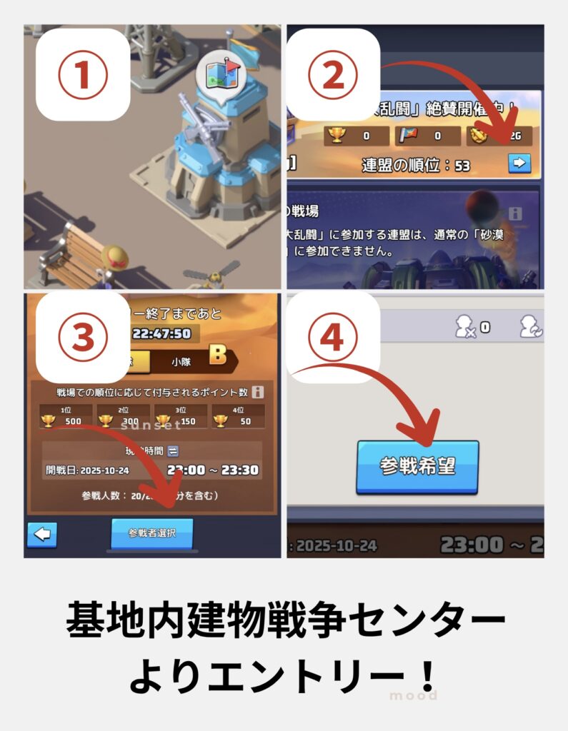 戦争センターからしかエントリーできません。エントリーすぐ始まっているので見逃さないようにしてください。(盟主がするやつじゃなくてみんながABを選択してエントリーするほうのやつ)