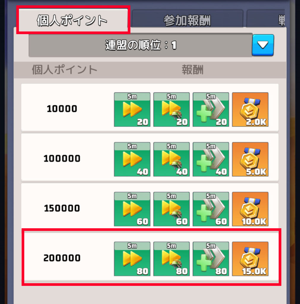 20万でMaxです。個人ポイントは報酬が良いのでしっかり狙ってください。そして20万達成したら、それ以上個人ポイントを稼ぐための行動をしても意味がないので、今度は「連盟ポイント」を稼ぐ方法を実行してください。