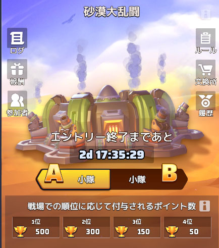 【ラストウォー】砂漠大乱闘はシーズン4(110日目)に始まるイベントです。参加条件・エントリー成功・エントリー失敗・チームABによる報酬の違いなど「砂漠大乱闘」の概要紹介ページです。