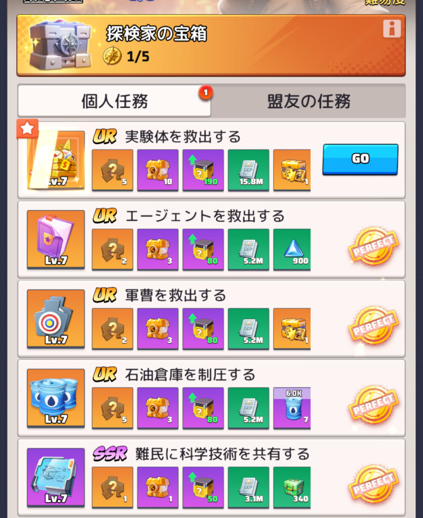 本部レベルによっては一日に遂行できる任務数が8の人もいます。その場合は+1で9個です。