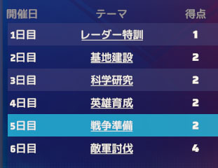 6日目の敵軍討伐対決は勝ったとき得点4なので注意してください。