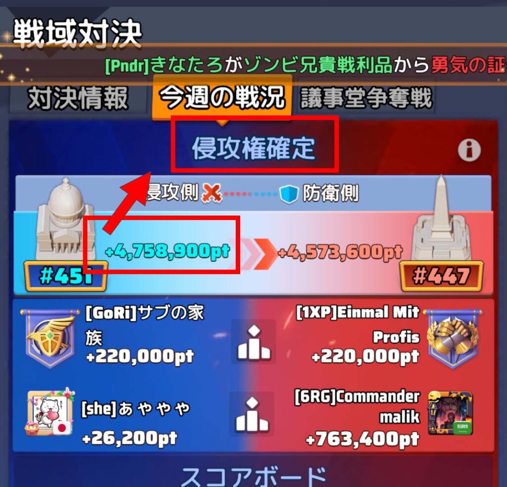 戦域対決において侵攻権が取れた場合は、野良狩りによるポイント獲得(宝箱9個 全開封)が容易です。