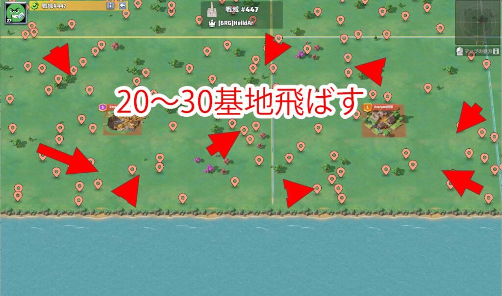 基地攻撃するだけではなく「飛ばす必要がある」ことだけご注意ください。20~30基地ほど飛ばします。相手の基地レベルは3で5でも30でもなんでもOKです。いわゆる死んでそうな基地を飛ばすだけです。