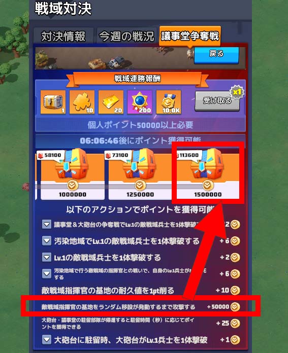 相手の基地を飛ばすごとに50,000p入ります。20~30基地を飛ばせば150万ポイント達成です。達成すると報酬がとても良いです。10分くらいでやれると思うので、ぜひ参加してみてください。