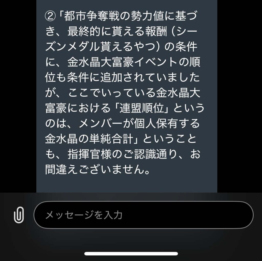 金水晶大富豪イベント自体に、連盟としての保有量ランキング報酬はないのですが、勢力値ランキング(シーズンメダル貰える最後のやつです)において、金水晶大富豪イベントの連盟順位が、より良い報酬をもらうためのチャンス条件に設定されています。