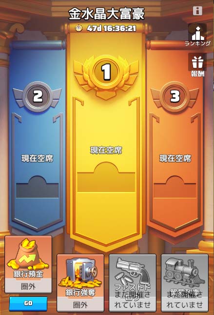上の画像のトロフィーなら、勢力値ランキングで21~50位に入っても貰えるし、銀行強奪ランキングや預金ランキングで2~3位に入っても貰える。条件は厳しそうですが、勢力値ランキング以外にもトロフィーを貰える可能性が増えたということはチャンスと言えるでしょう。厳しいそうだけど(笑)